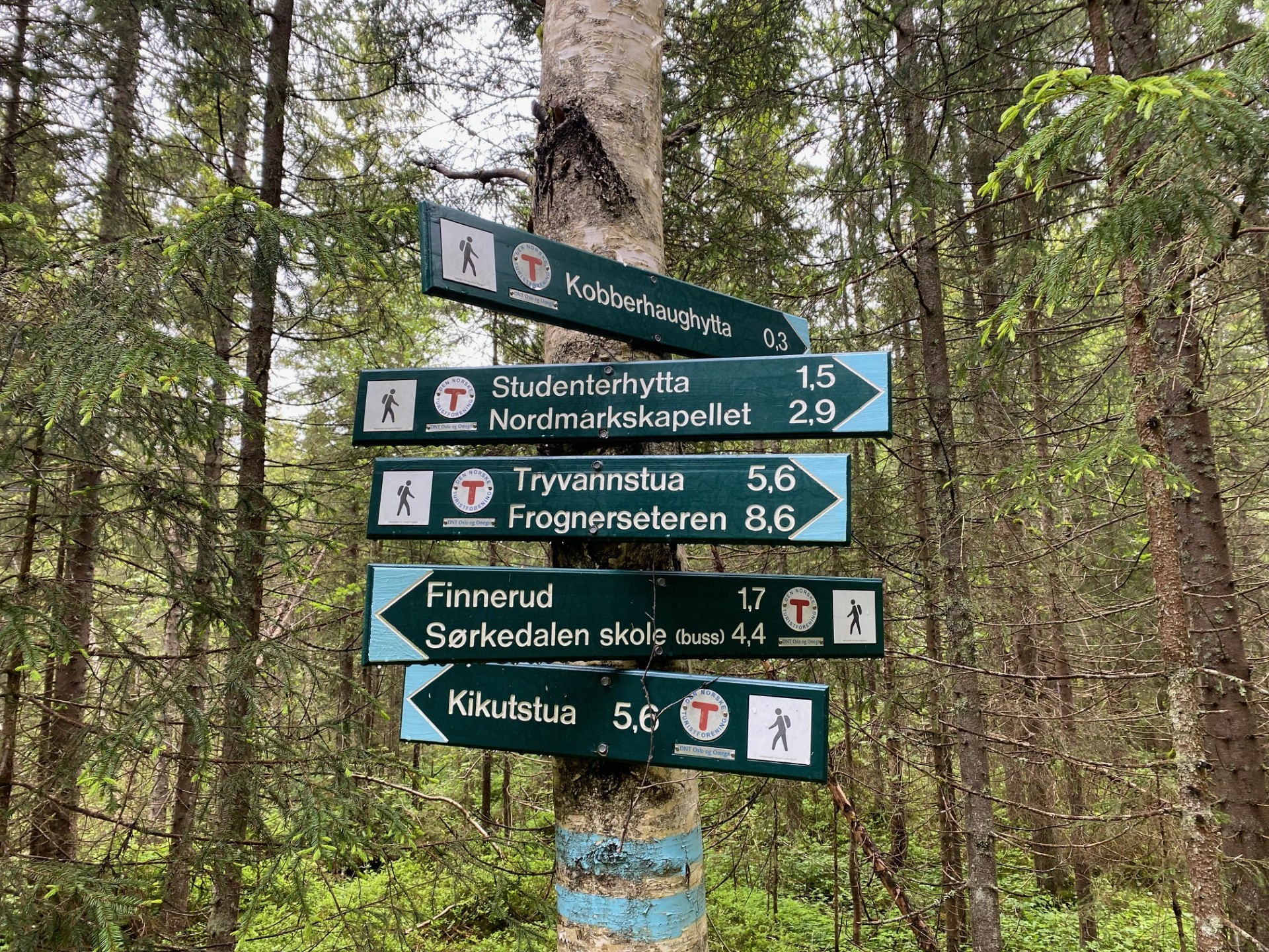 Samme sti tilbake. Legg gjerne turen innom Kobberhaughytta og ta en dukkert i nydelige Kobberhaugtjern. Sykkel tilbake til Frognerseteren, eller ned til Sognsvann.