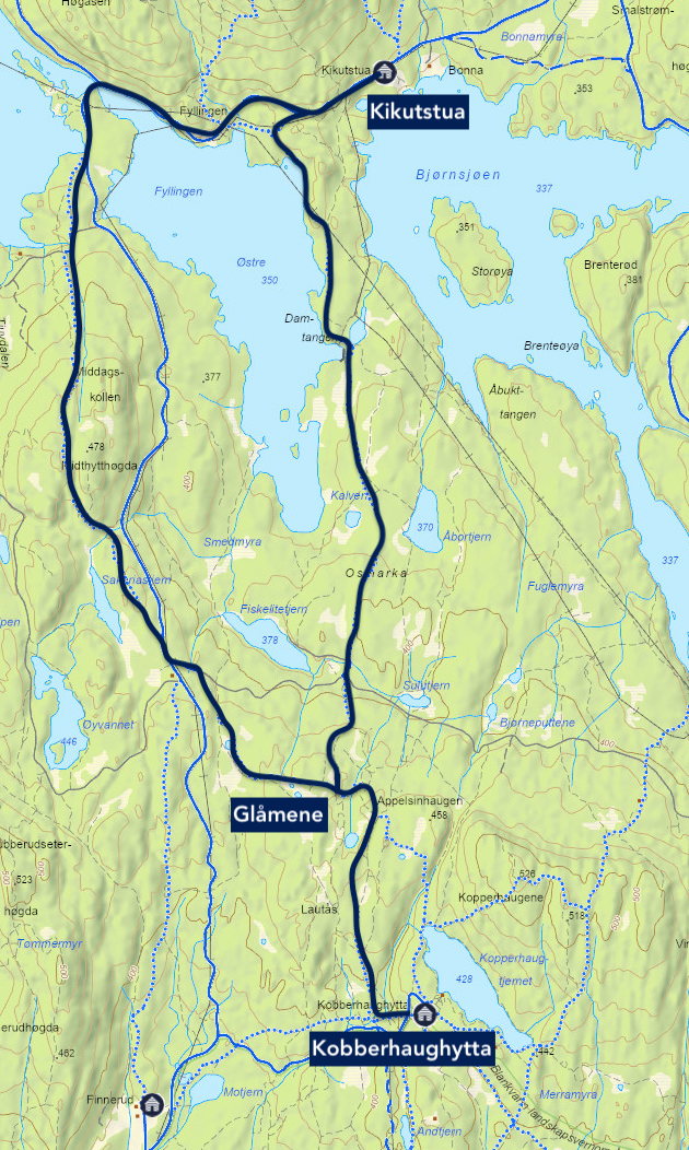 Blåstien stryker langs etter Glåmene. Røde staker bortover myra markere der skiløypa går om vinteren. En ikonisk løypetrasé mange skigåere har et helt spesielt forhold til. Ingen skisesong uten en tur over Glåmene. Stien videre mot Kikut fører opp til en fantastisk utsikt over Fyllingen, vest for Kikut. Det aller stykke inn mot Kikut går på skogsbilvei. På Kikut er varmestua alltid åpen.