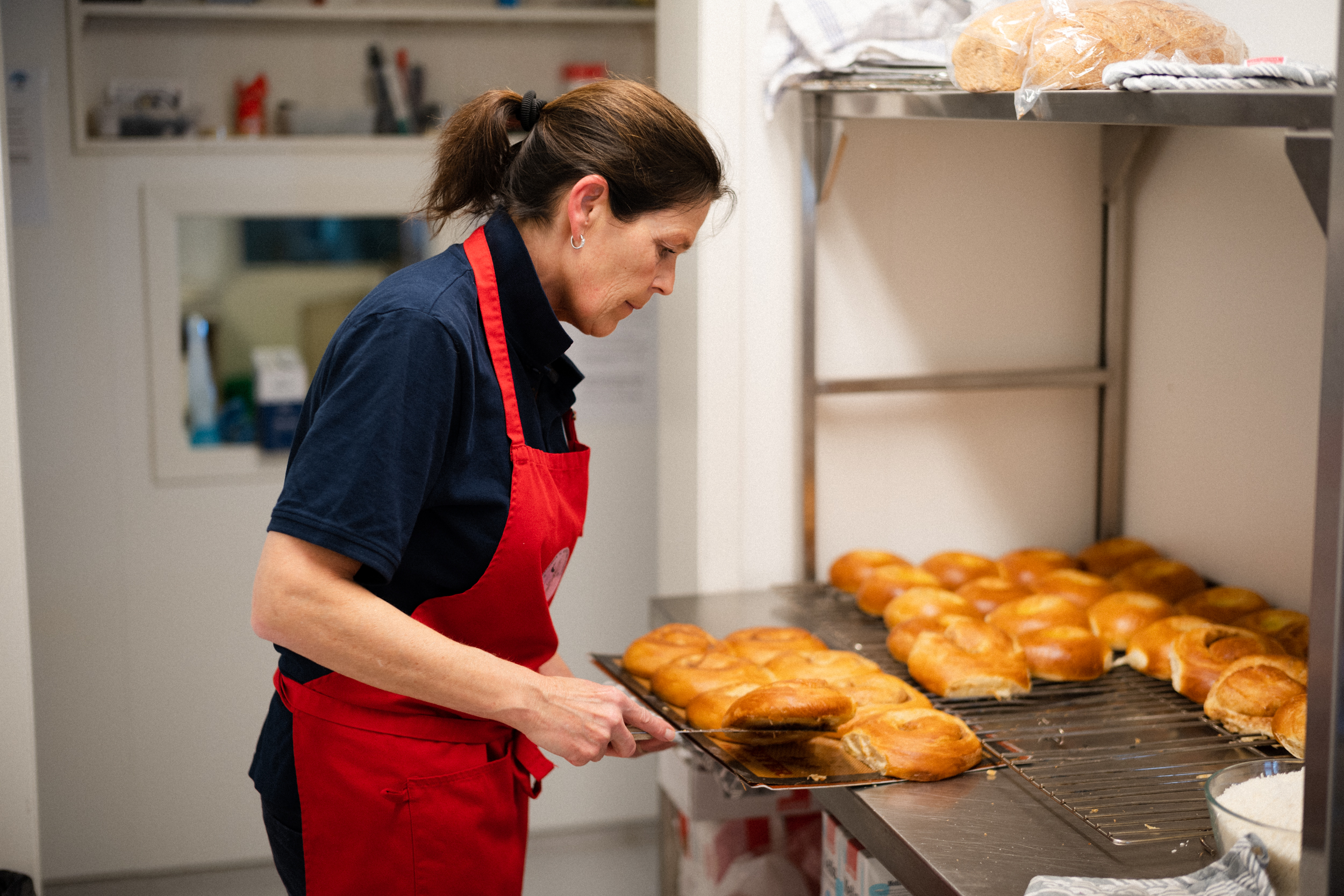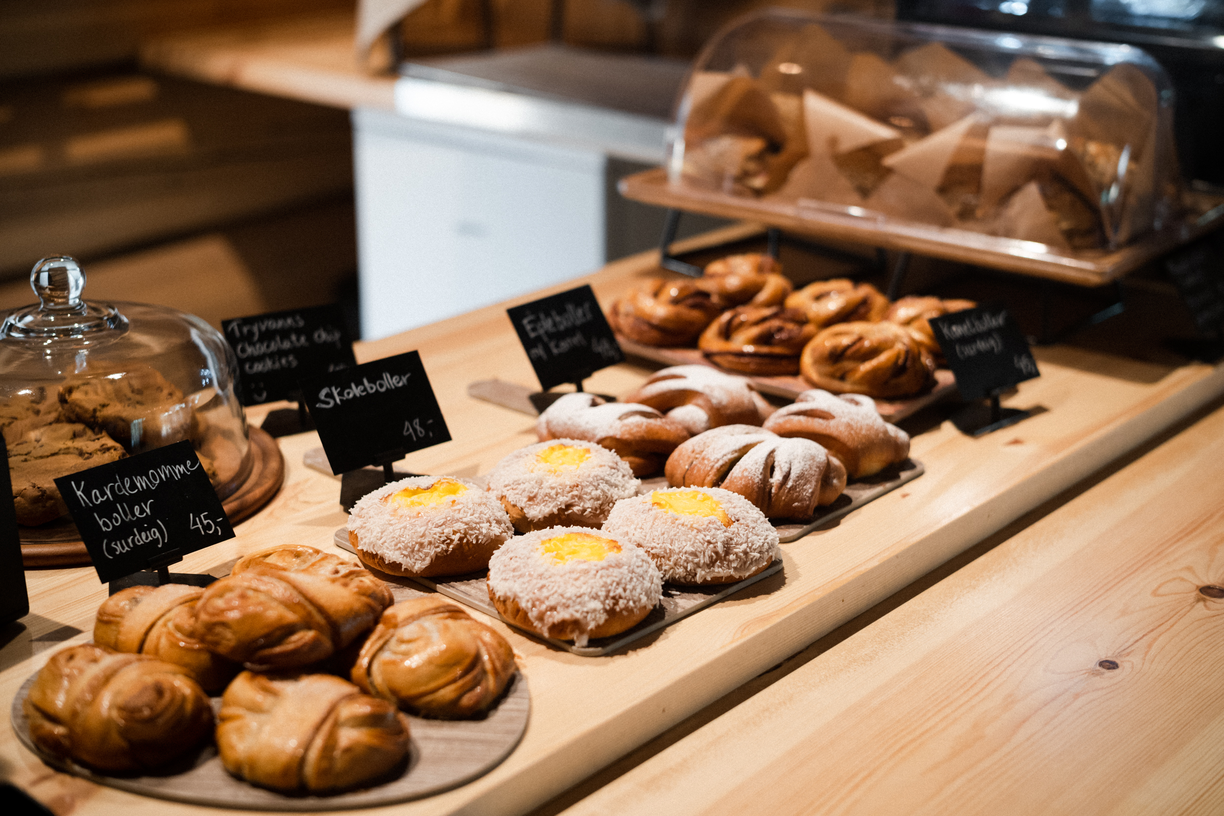 Grunnbakst som kanelsnurrre, kardemommeknute, solbærbolle, skolebrød suppleres med ekstra utvalgt i helgene. Alexander og kona Lene har så langt bakt alt selv. Nå er forsterkninger på plass på kjøkkenet. Målet er ikke størst mulig utvalg, men høyest mulig kvalitet, og mest mulig bruk av lokale råvarer.