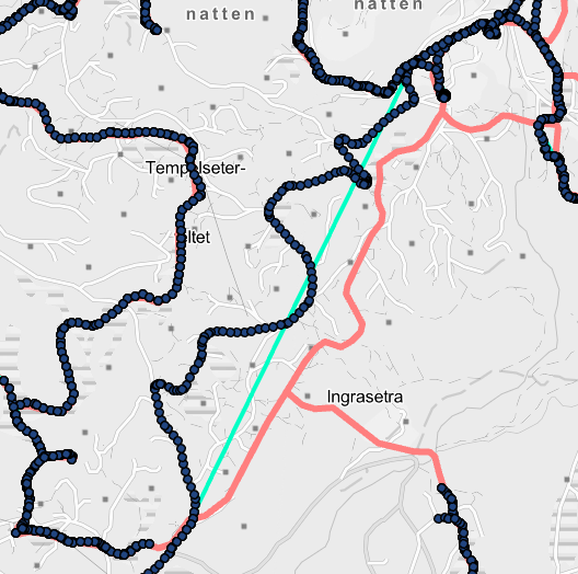 Bilde 5: Den gule strekningen deles i 2, fordi den ene grønne prikken i midten knytter seg til et løypesegment i en annen destinasjon.