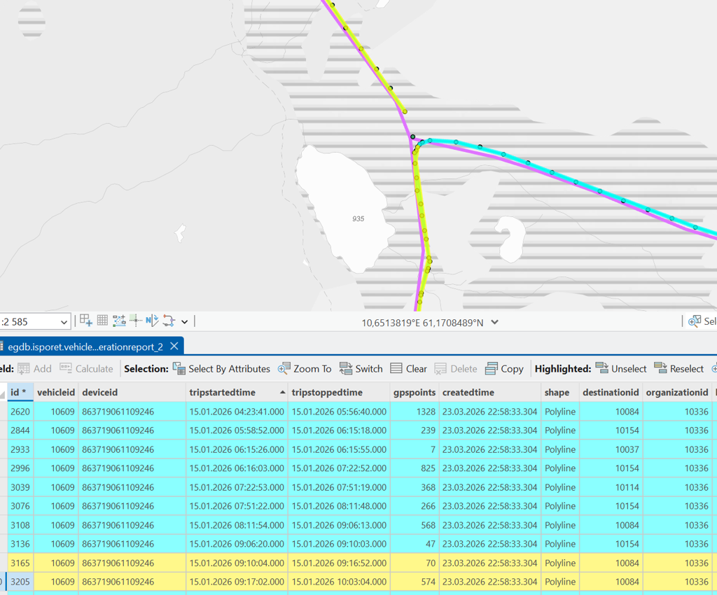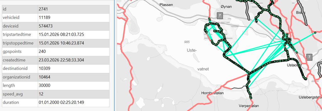Disse “kjøringene” har egenskaper som gjør at vi kan plukke de bort før rapporten blir generert. Dette er typisk strekninger med få gps-punkter, hvor strekningen er lang og hastigheten unormal.