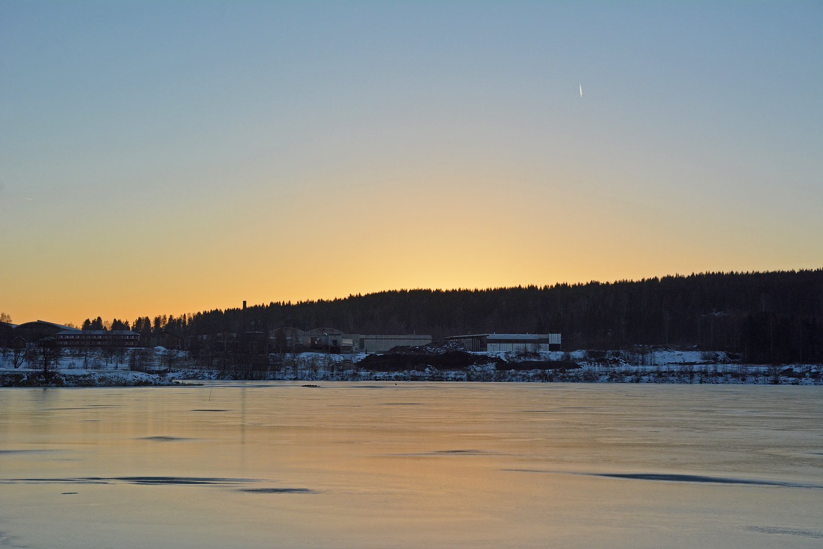 SOLSTREIF PÅ ISEN: Solen balanserer nå på åskanten, og ved Solberg streifer de siste strålene elveisen.