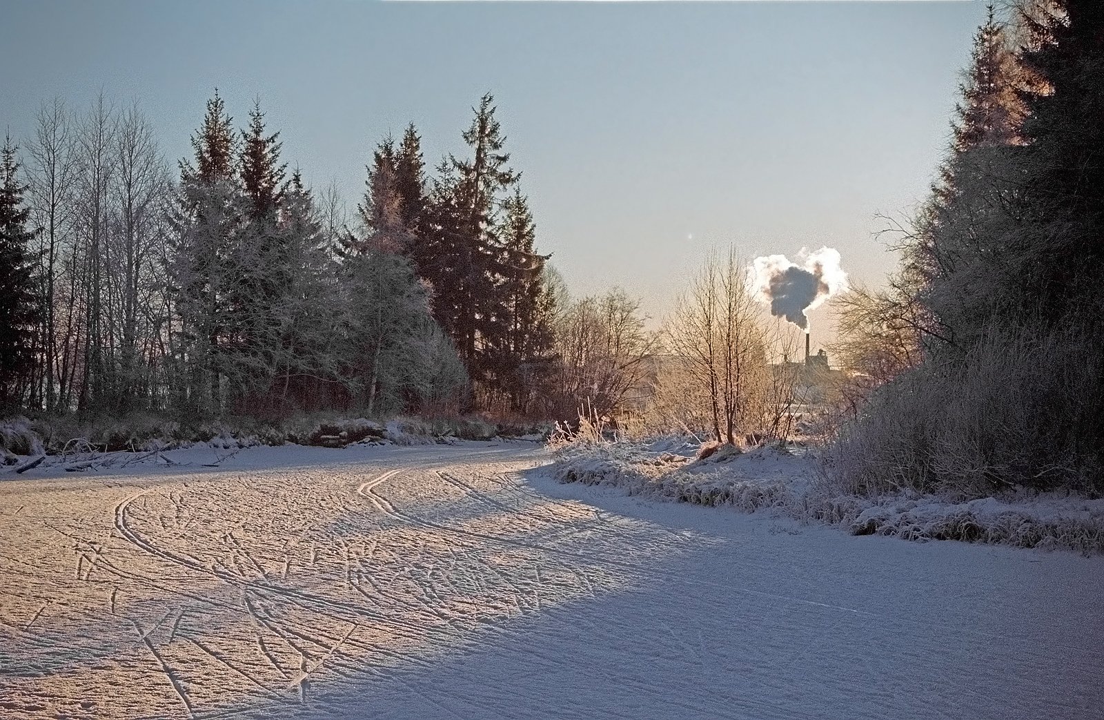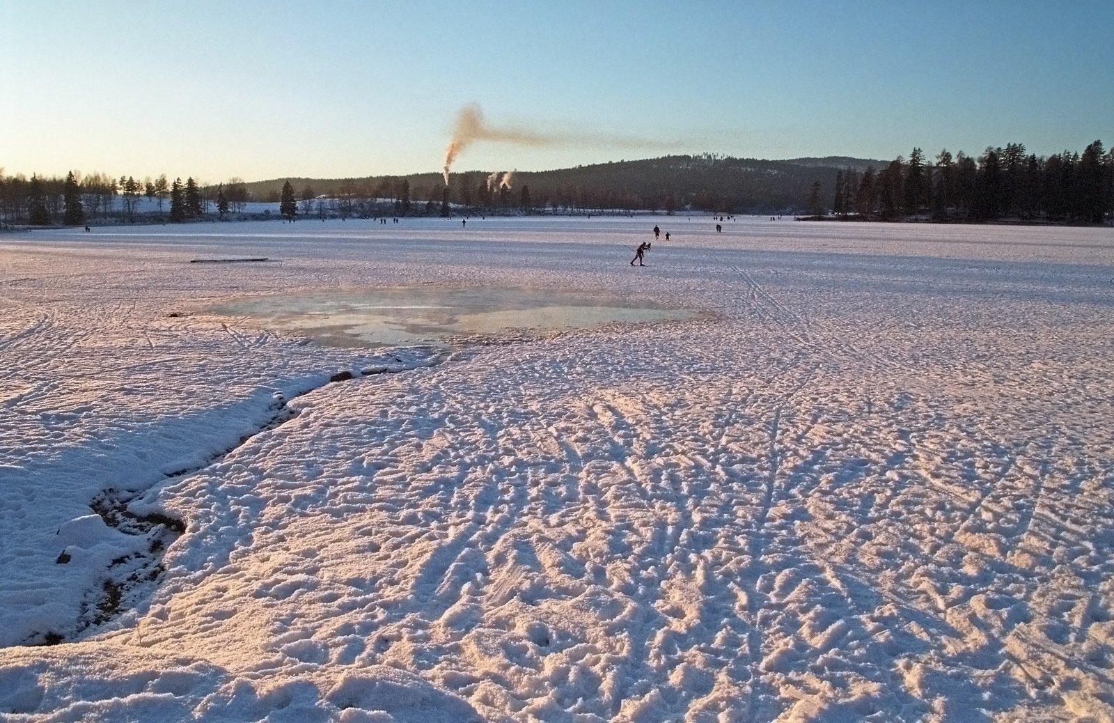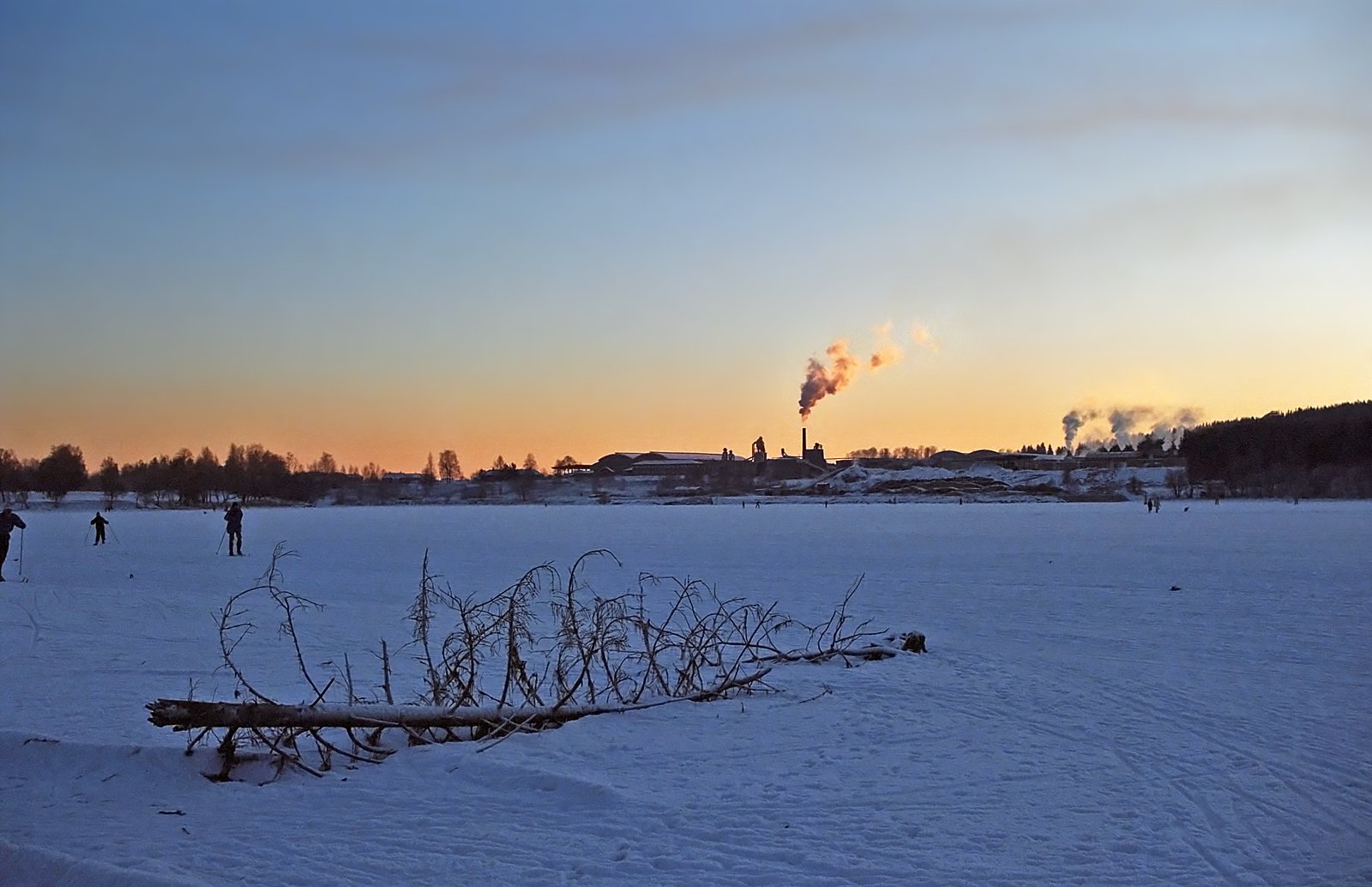 Ute på isen dominerer Fossum Brug utsikten mot syd. Selv midt på dagen nå midtvinters klarer ikke solen å stige klar av dampskyene fra bruget, som kaster lange og dramatiske skygger over isflaten. Opp av isen stikker en rad med tømmerdopper. Et minne fra en ikke altfor fjern fortid da vassdragene fortsatt var viktige for tømmerdriften i Marka.