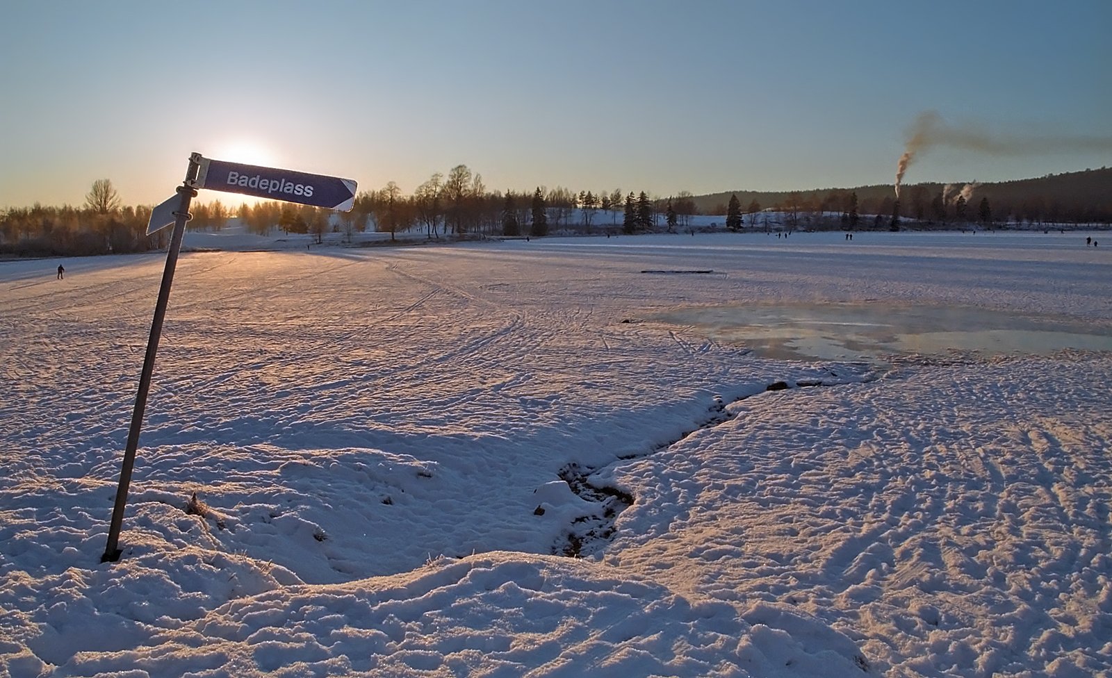Skiltet med «Badeplass» har ikke tatt juleferie. Til ære for skiltet var det fortsatt litt åpent vann omgitt av frostrøyk. Ingen badegjester, men en milsluker på ski med Birken i blikket, der han haster av gårde rundt vannet langs strandkanten for å få sin dose med mengdetrening.