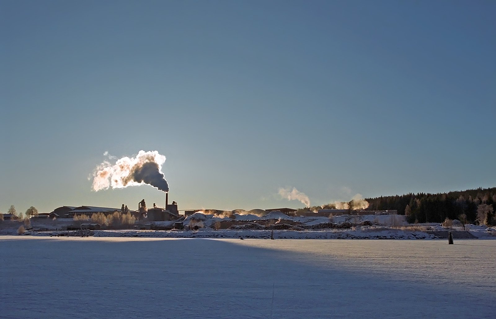 FULL DRIFT: Det er full drift ved Fossum Brug, og dampskyene fra tørka kaster lange og dramatiske skygger over isflaten.