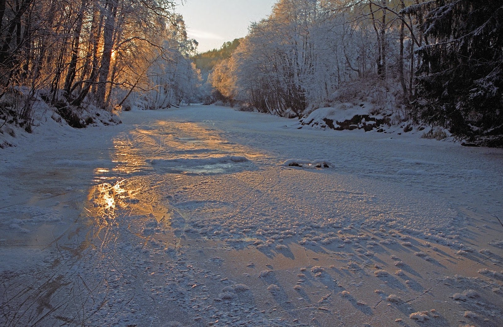 SOLBLINK: Tett kratt langs elvebreddene og tykt rim gjør at solen stort sett bare viser seg som blink mellom trærne, om ikke elva har helt riktig retning i forhold til solen slik som her.