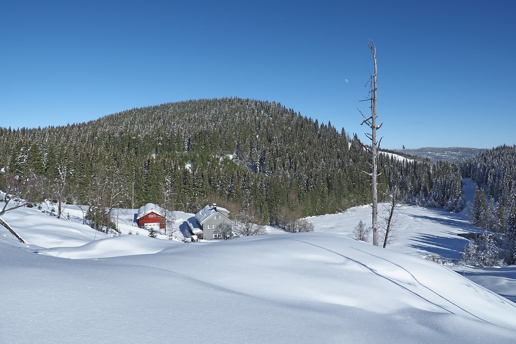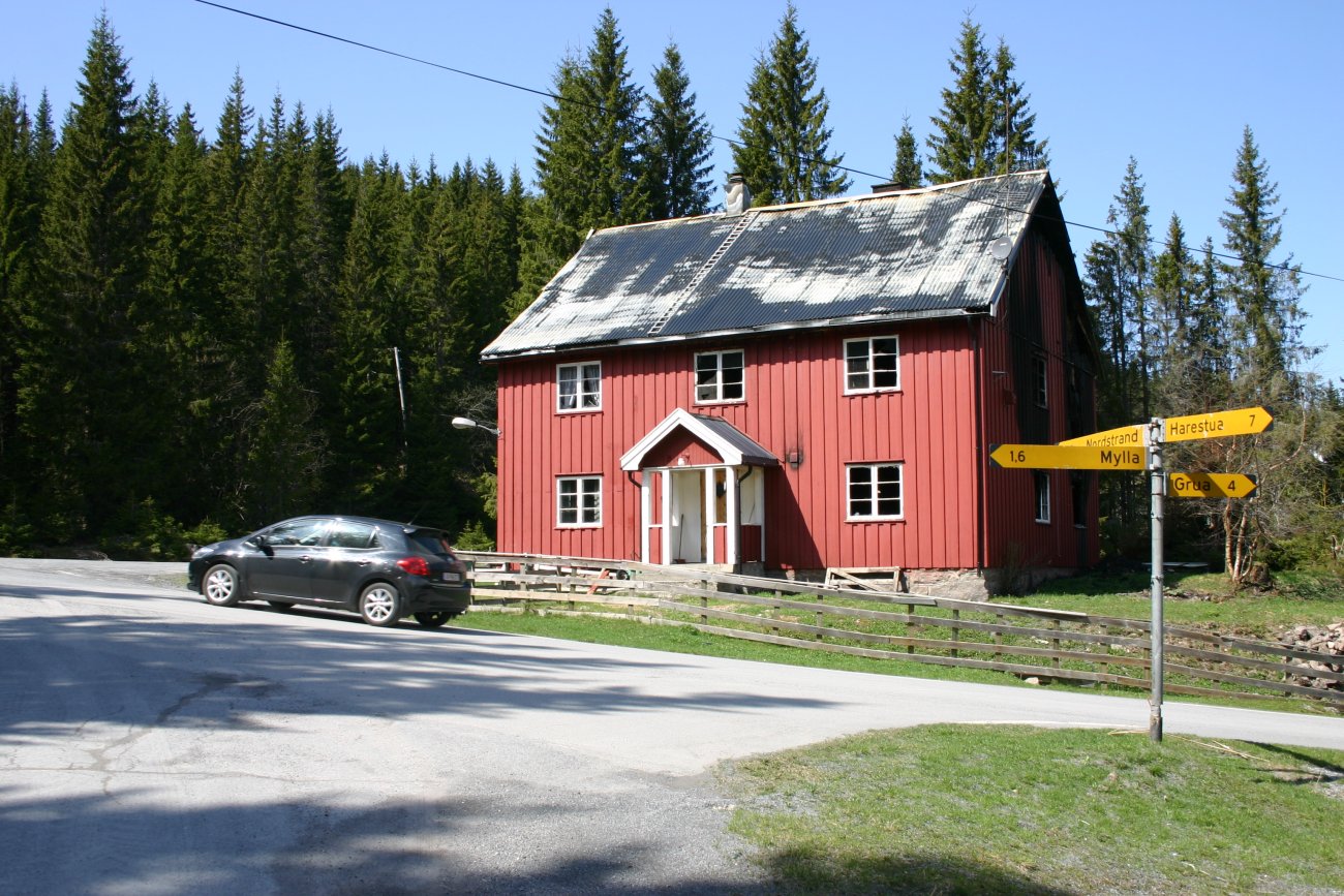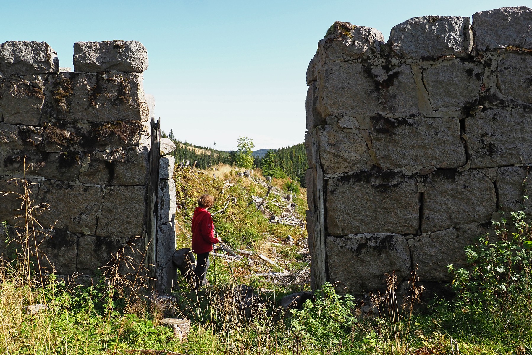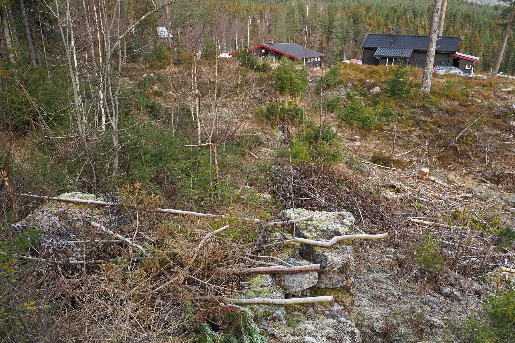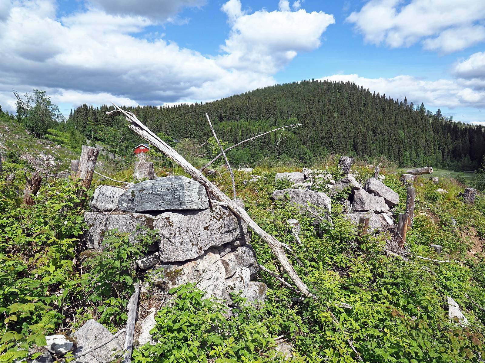 ADMINISTRASJONEN: Fortsetter man videre et lite stykke nedover fra bordet med benker, er det fri utsikt mot nordøst mot Knippehøgda. I forgrunnen ligger det som var administrasjonen av Sliperiet. Veien i skyggen ved høyre bildekant er Myllaveien fra Grua.
