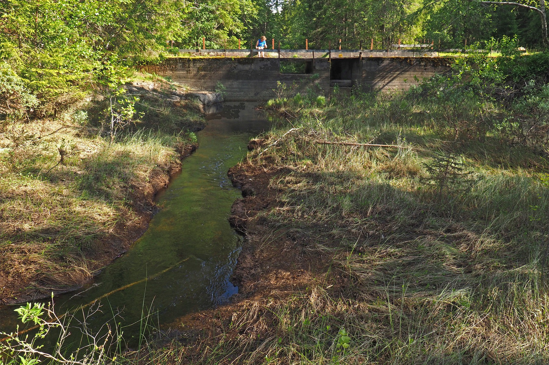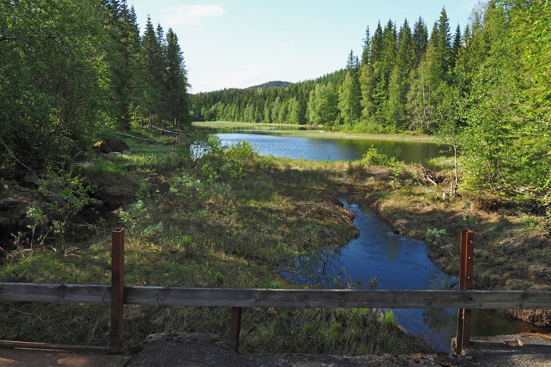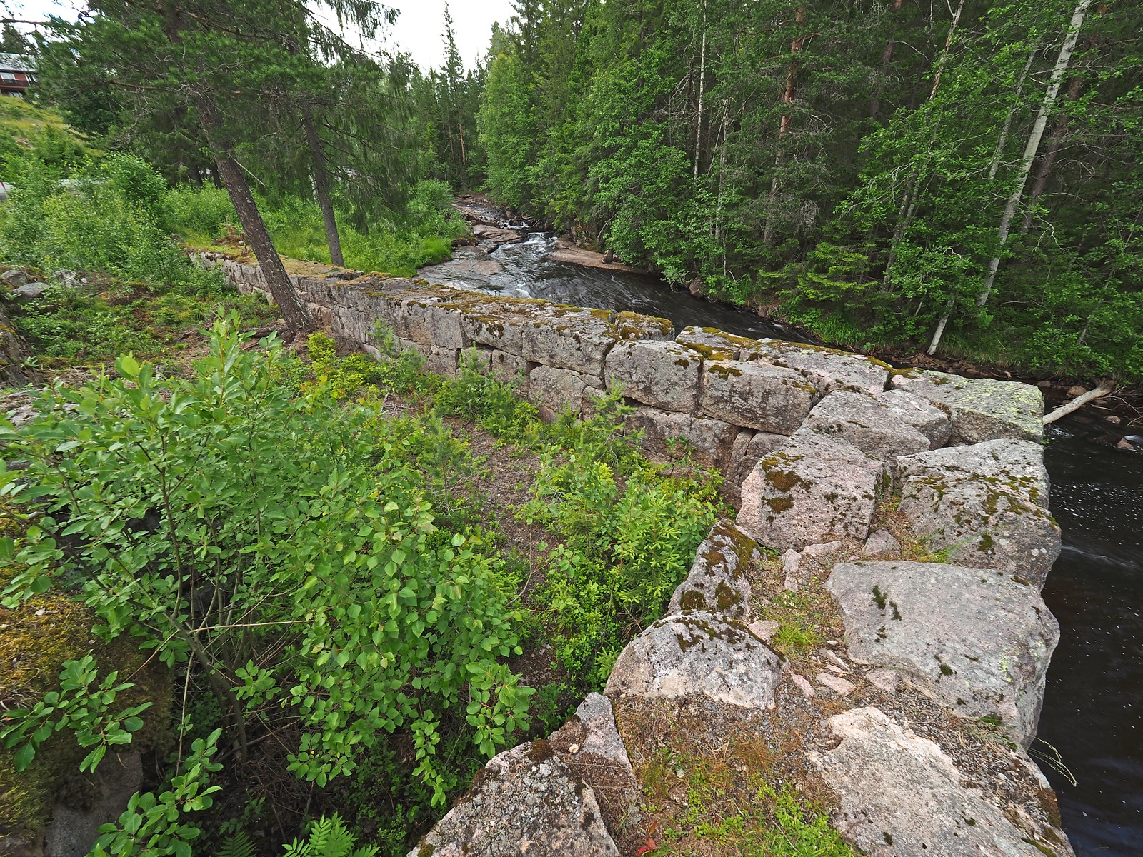 TØRRMURT GRÅSTEINDEMNING: Fra bilveien ser det ut som ei bru, men det er en demning med bunnluke, tappeluke eller muligens fløtningsløp, og overfall på to nivåer. Dette er en tørrmurt gråsteindemning, antageligvis bygget etter storflommen i 1908, og senere tettet med støp på vannsiden. Flytetorver demmer nå opp vannet før demningen.