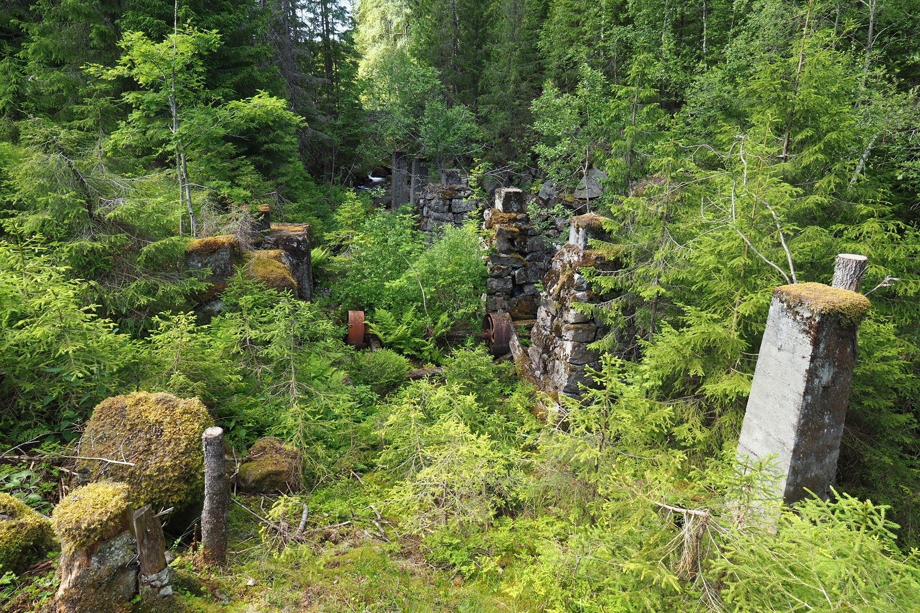 REGULERINGSDEMNING: Demningen ovenfor sliperiet var reguleringsdemningen for vanntilførselen til sliperiet. Dette var tappeluka, med jernbolter og rester av føringer av treverk. I hogstfeltet nedenfor finnes fortsatt rester av understøttelser av gråstein med jernhaker til rørledningen fra demningen.