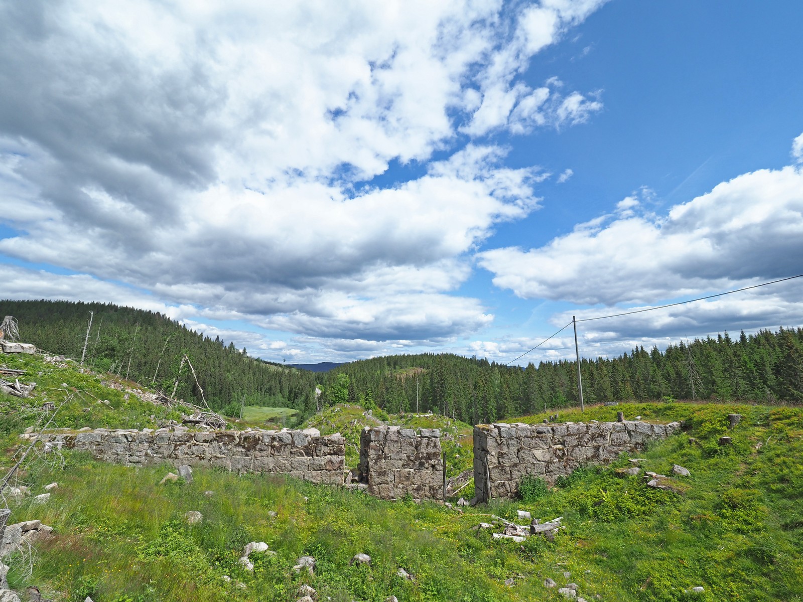 DEKKET AV SKOG: Denne demningen har vært gjemt av stor skog i mange år, og var nok temmelig ukjent, selv om skiløypa gikk rett forbi. Nå har flatehogsten åpnet opp landskapet, og slik tar den seg ut fra skiløypa en julidag. Bak demningen er det nå nesten gjengrodde øvre delen av magasinet til saga, Knippahøla, synlig.
