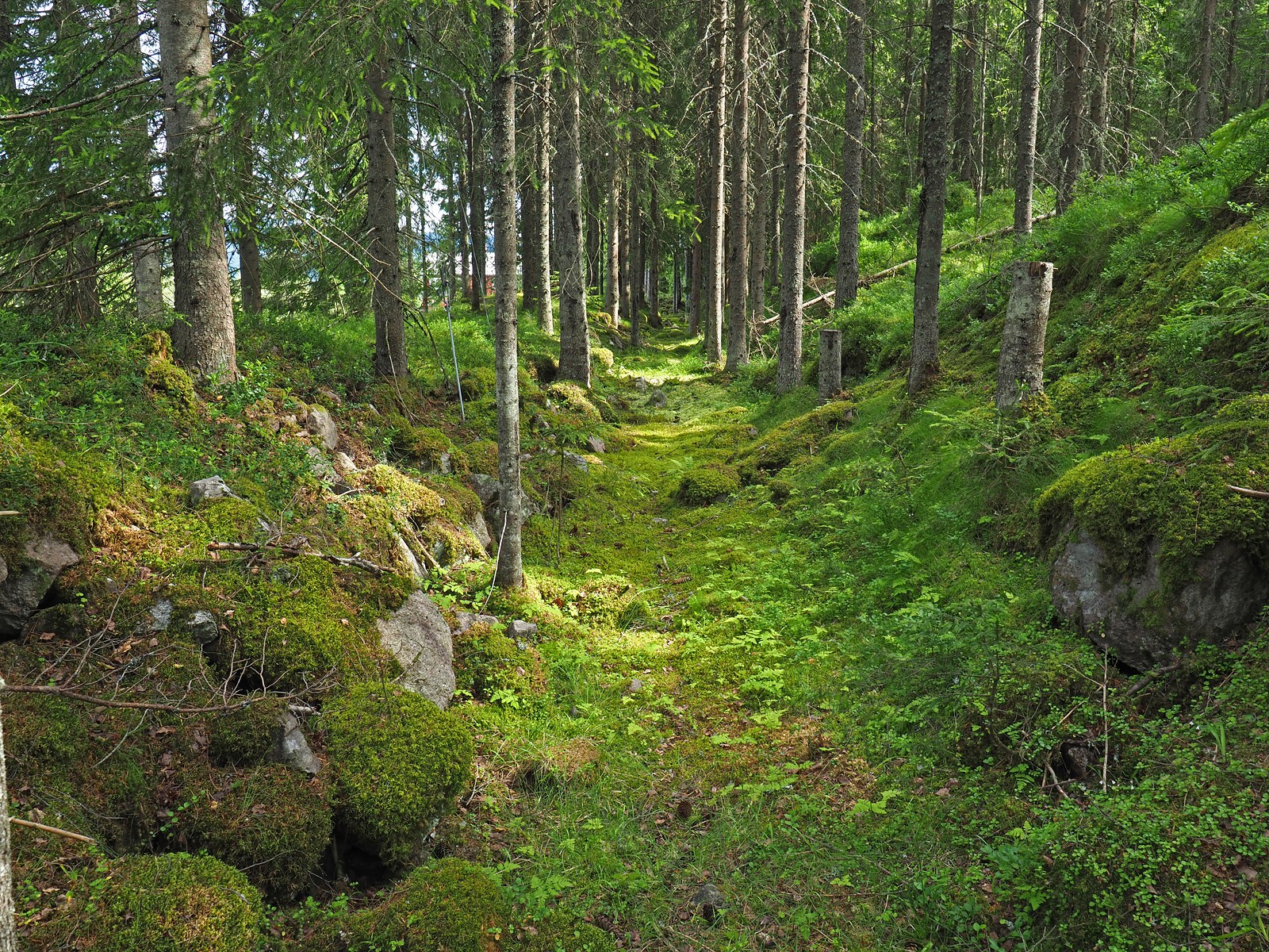 VANNKANAL: Det ser ut som en driftsvei, og vinterstid er det også skiløypa mot Svea. Men her var det opprinnelig gravd en kanal som ledet vannet vekk fra selve Myllselva og til reservoaret som demningen laget. Kanalen ble ødelagt av Myllsveien da den ble oppgradert, men er synlig ved utgangen av skjæringen mot nord.