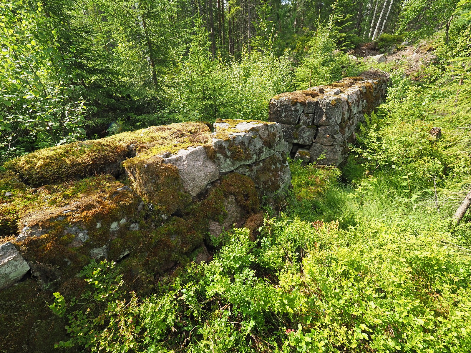 HESTESKOFORMET MUR: Fra Kubbdammen og nesten til Friland går det en gravd kanal. Den går helt inntil den solide murkonstruksjonen på bildet. Hva murkonstruksjonen hadde for funksjon, er ikke kjent for Lunner historielag. Fra utløpsdemningen i Kubbdammen til muren er det nesten ikke fall, og det er heller ikke flere rester etter installasjoner lavere i terrenget. Hvis de lagret tømmerstokker i Kubbdammen og skar kubb før tresliperiet, kan den ha hatt noe med kubbkapping å gjøre, men det blir gjettverk.
