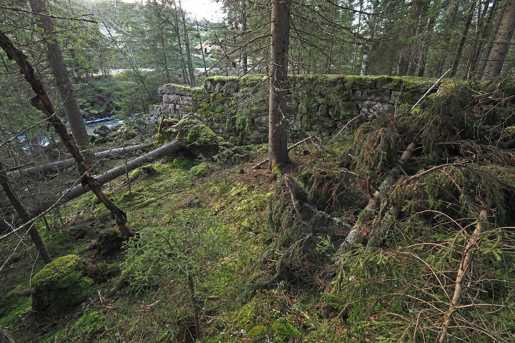 GRUNNMUREN TIL BOLCHEN TRÆSLIBERI: Også i den nedre bratte delen av Myllselva ble det anlagt et tresliperi på 1870-tallet. Det fikk navn etter Hans Bolchen, som var primus motor i arbeidet. For å drive dette og skaffe til veie tømmer (kubb), ble det gravd kanaler og bygget demninger for å øke fallhøyden. Denne solide muren skal være grunnmuren til fabrikken. Her er ikke spor etter noen turbin, men litt lenger ned i elva er det noe som ligner på en liten fangdemning. Men drivvannet skulle komme fra Kubbdammen, og den skulle ligge i en helt annen retning. Her er det mye usikkert. Dette anlegget ble også delvis ødelagt av en flom i 1908, men ble bygget opp igjen. Det ble nedlagt før 1914.