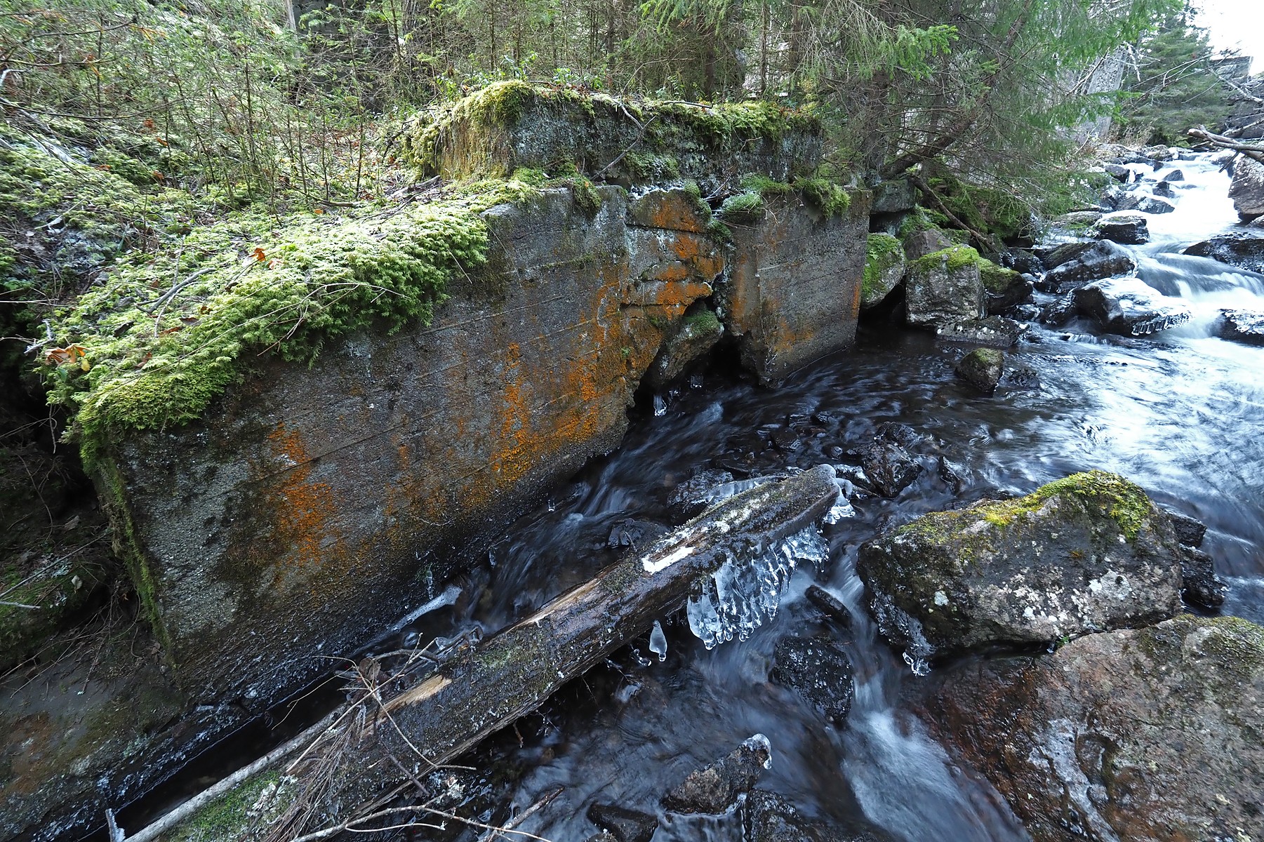 FANGDEMNING: Rett nedenfor Bolchen Træsliberi står disse restene av en demning. Det må ha vært en fangdemning til en eller annen installasjon lenger ned i elva, for det er ikke plass til noe reservoar på oversiden, kanskje til Blyverket. Demningen holdes på plass med jenbolter i hull som er boret ned i svaberget som elva renner over.
