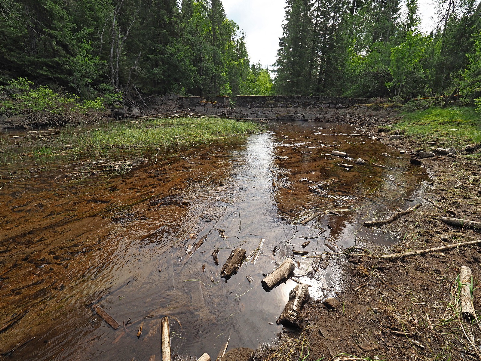 BEST Å SE FRA NORDSIDEN: Det er ikke lett å få et godt inntrykk av Noackdemningen fra veien, særlig når det er løv på trærne. Men fra nordsiden og uten løv går det ganske bra, om man først finner ut hvor elva kan krysses og tar turen gjennom myr, beverfelte trær og tynningshogst. Her er luftsiden med elva i bakgrunnen. Demningen er i sementfuget gråstein. Demningen brøt sammen i storflommen 1908, ble gjenoppbygd, men ikke vedlikeholdt etter at Bolchen Træsliberi ble nedlagt en gang før 1914. Senere storflommer har ødelagt lukepartiet og mer til.