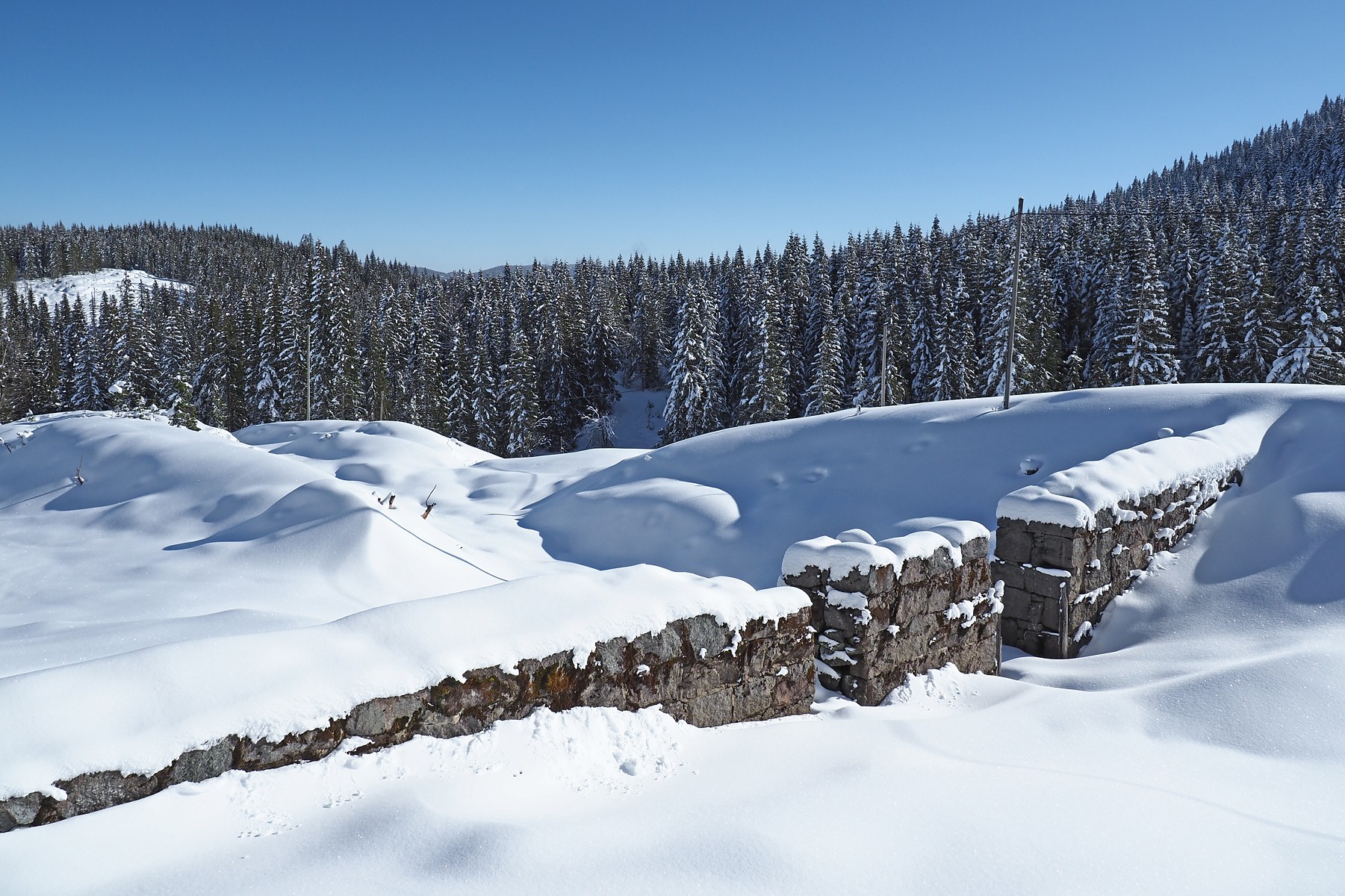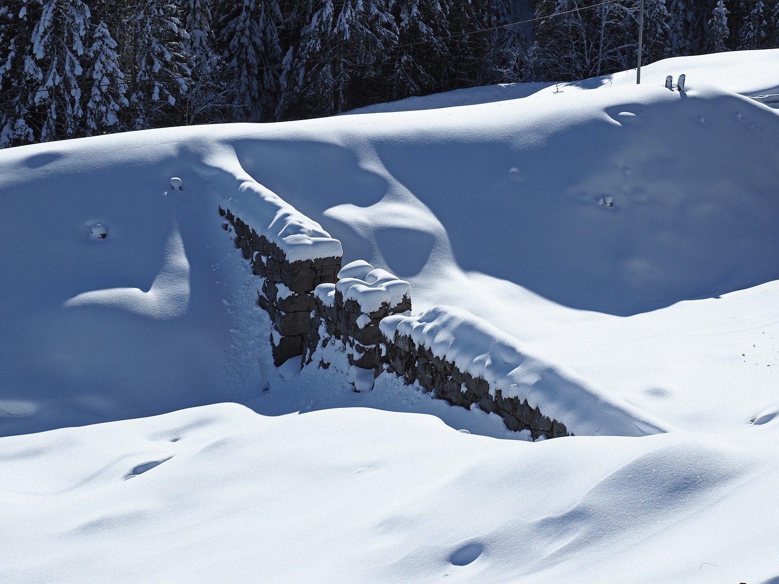 SPOR I SNØEN: For å se luftsiden av demningen, må man ut av løypa omtrent ved det nedsnødde bordet med benker. Her var det noen interessante detaljer i nysnøen, spor etter dyr og/eller spor etter vind?