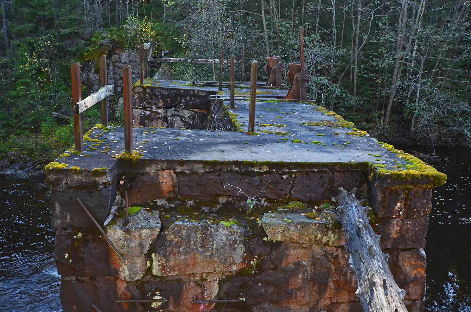 STÅR STØTT: Den midtre delen av demningen består av en steindemning med krone av betong, og har klart seg bra mot tidens tann. Deler av reguleringsmekanismen er fortsatt på plass. Selve steinkonstruksjonen er avsluttet som en horisontal flate, mens betongen er lagt med hellning mot vannsiden.