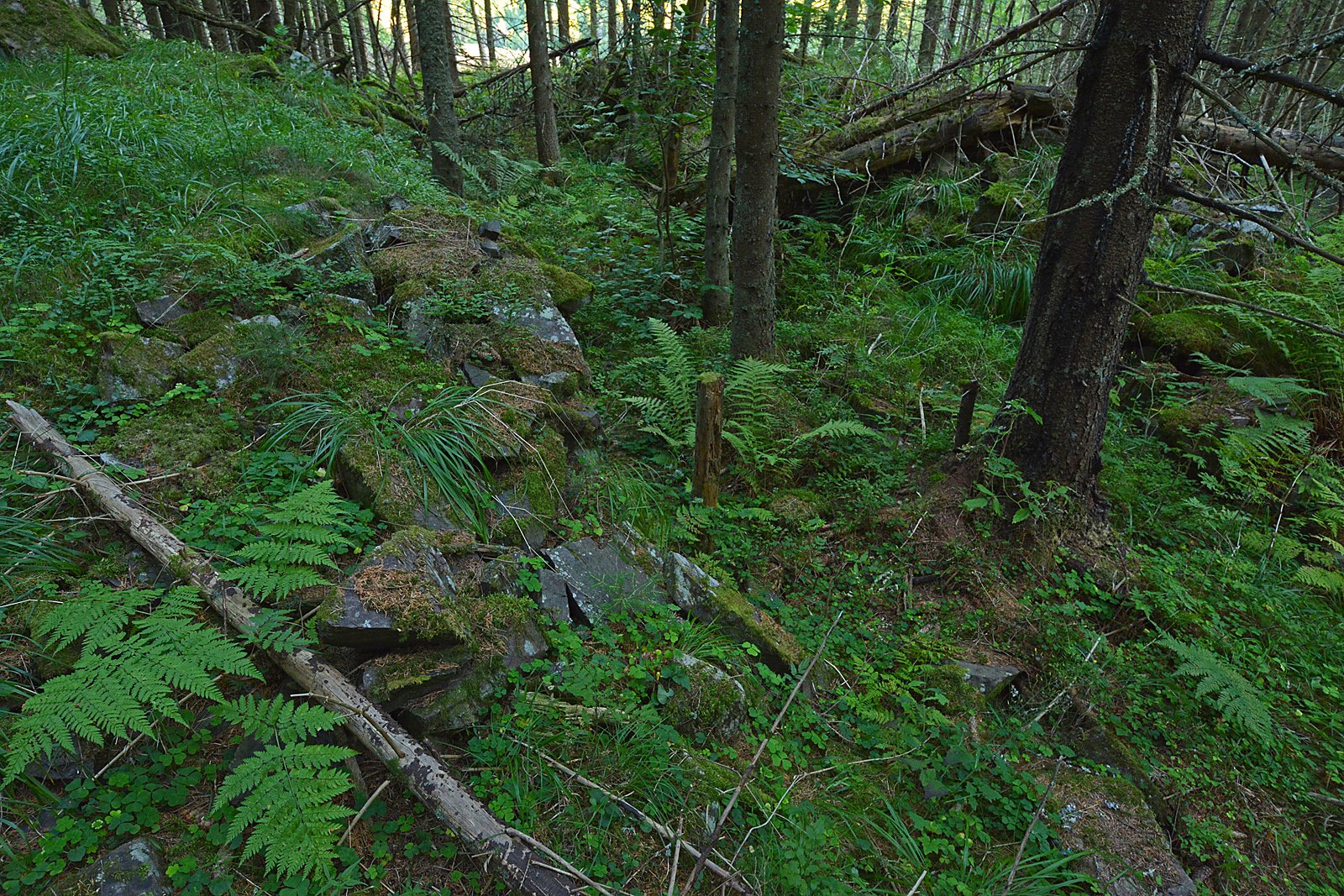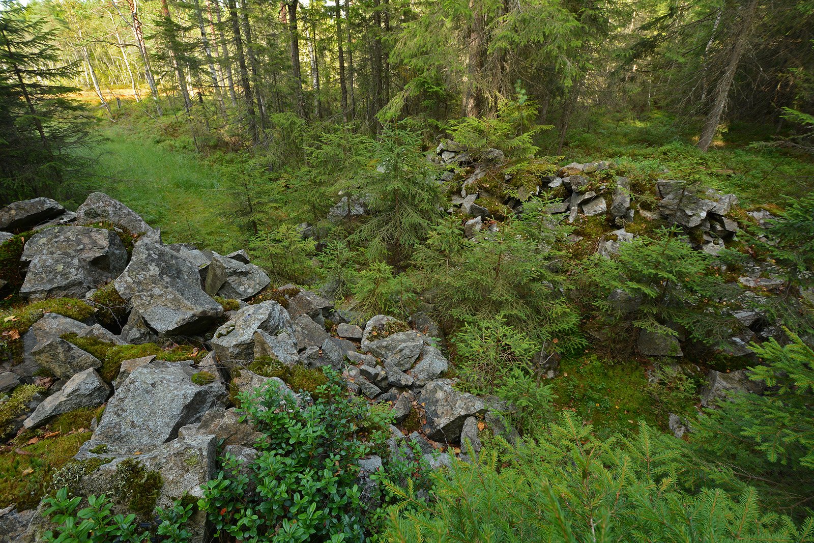 FLØTNINGSDAM: Følger du kanalen mot syd fra Vestre Otertjern inn i skogen, finner du de to steinrøysene på bildet, en på hver side av kanalen. Slike røyser er ganske typiske for laftedammer hvor tømmeret har råtnet ned. Inne i skogen er det også en rad med stokker som er slått ned i myra/skogbunnen som en fortsettelse av steinrøysene. Dette er rester av fløtningsdemningen som var starten på tømmerrenna ned til Slora, og den fortsatte i en utgravd renne videre nedover i skogen. Plasseringen av en demning på en høyde hvor vannet har naturlig avløp i motsatt retning, virker nokså ulogisk. Men en atthaldsdam av stein over avløpet i nord hevet vannstanden med tre meter, slik at Otertjernene gikk i ett. Jeg mener at vi fant spor etter denne på tilbakeveien da vi hadde besøkt kjentmannspost nr. 14 2008-10 i oktober 2008, men da var det kaldt, tett tåke og sludd/regn, og det ble ingen bilder der. Jeg mener også å huske at jeg fant deler av tømmerfagverket som bar tømmerrenna første gang jeg var i området for vel 40 år siden, men heller ikke da ble det tatt bilder.