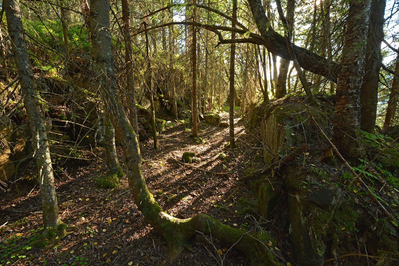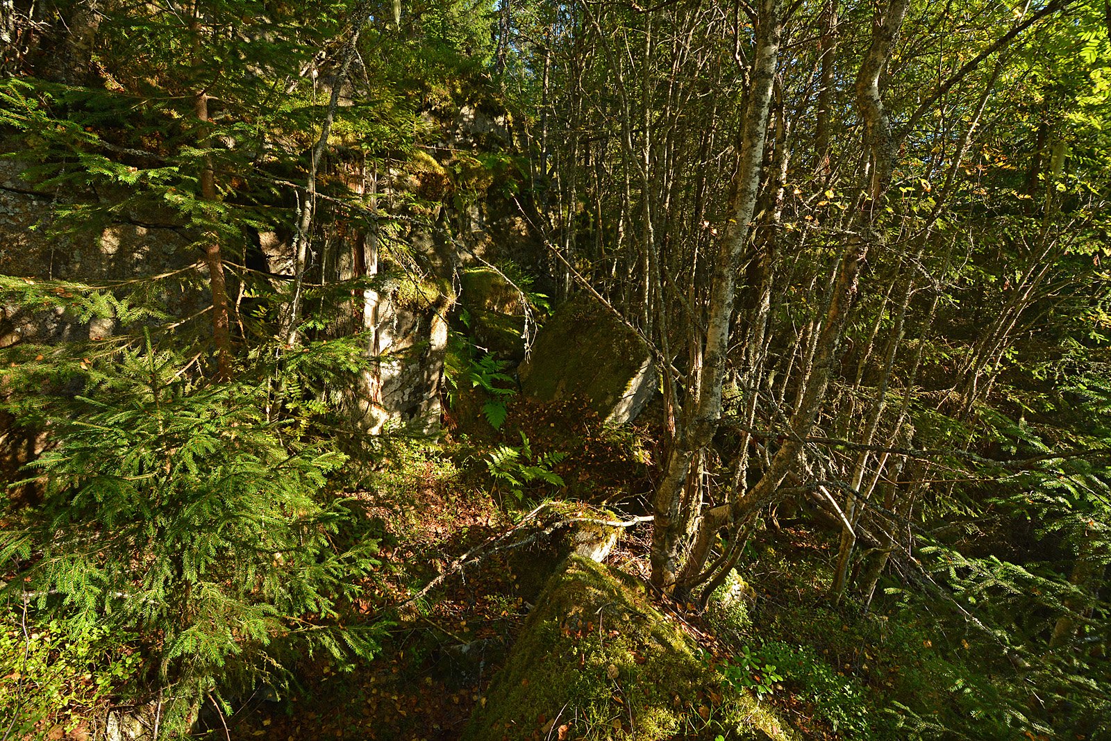 STUP: Den utsprengte renna ender over et stup, såpass høyt at man ser rett i trekronene på de velvoksne granene i dalen under. Her er det ikke sannsynlig at tømmerrenna har gått rett frem. Alternativet er en dreining mot øst inn i området med store steiner og skrenter på dette bildet. Jeg prøvegikk det, ikke ufremkommelig, og det hele flatet seg ut mot myra som ender i Vestre Otertjern. I myra var det et tydelig åpent parti som gikk rett mot der renna er tegnet inn på et kart fra 1930. Muligens et spor etter renna, selv om det ikke var noen tydelige rester av renna der, og jeg nok heller ville lagt renna i den tørre kanten av myra. Men den er helt gjengrodd av kratt nå.