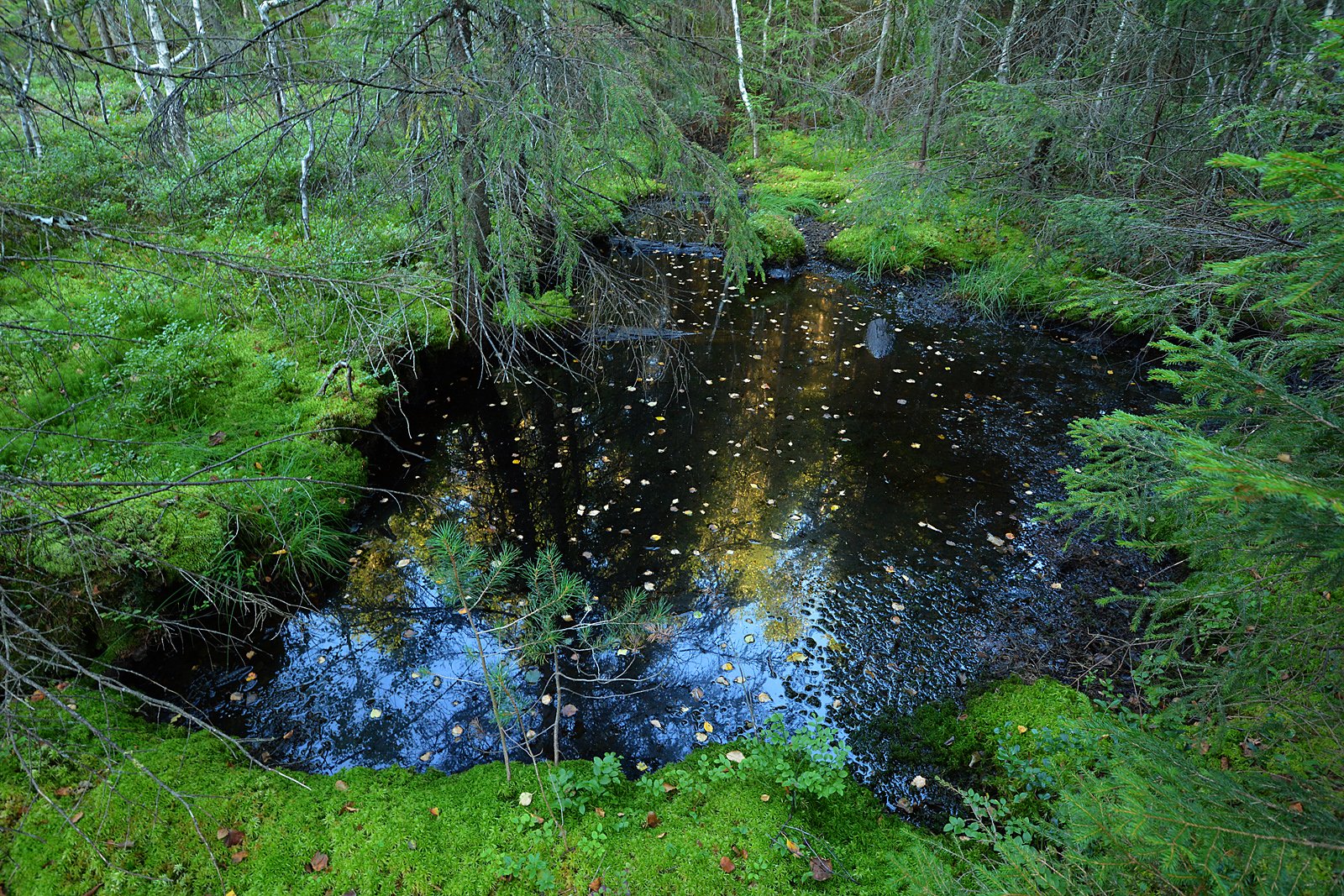 BUKKEDAMMEN: Det ser mørkt og myrgørraktig ut, og er det også. Men i vannet ligger noen solide stokker i en fortsettelse av en rad med bolter som stikker opp av myrmosen. Det er restene etter bukkedammen ved Otertjernsrennas utløp fra Otertjern mot Slora, omtrent det eneste som er igjen av synlig treverk etter renna.