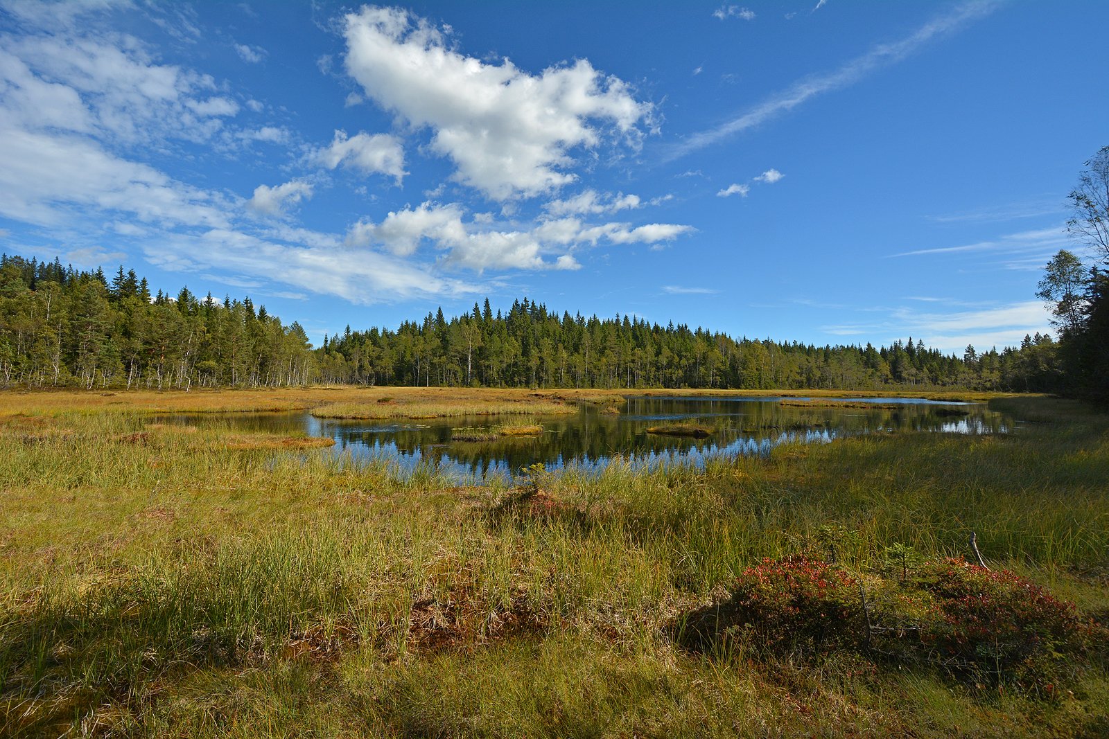 VESTRE OTERTJERN: Bildet viser Vestre Otertjern sett fra nordvestenden. Tjernet er omgitt av brede myrstrekninger overalt, unntatt langs vestbredden. Her er myra smal med upasserbare bløthull, og krattet langs kanten er tett og vanskelig å passere. Det er ikke å anbefale å gå langs vannet på denne siden. Rundt vannet ellers er det myr og flytetorver, vått, men ikke vanskelig å passere om man hele tiden planlegger noen skritt fremover. Litt til venstre for midten av bildet er myrtarmen til Østre Otertjern, hvor skiløypa krysser. Der ligger det stokker, men før det er det tuemyr som bekkesiget renner gjennom.
