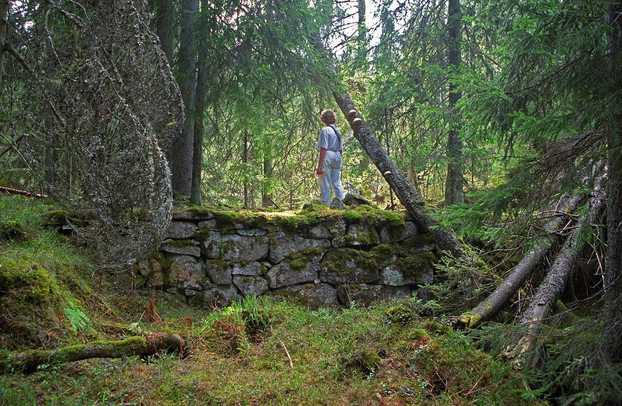 FINT STEINARBEID: Demningen ved Retthelltjern (A) er den eneste av de fire demningene som fortsatt ligger inntil vannet den i sin tid demmet opp. Et fint stykke steinarbeide, som har tålt tidens tann bra. Den ligger fortsatt nesten som en overdimensjonert steinbro på en gammel kjerrevei. Bildet er fra 2000, da det var nyhugget og åpent her fortsatt, og vi hadde lagt fjern/kulturposter i turorienteringen Flaggspretten i området. Nå har det vokst opp mye kratt, og demningen er ikke grei å fotografere, men fortsatt lett å se.