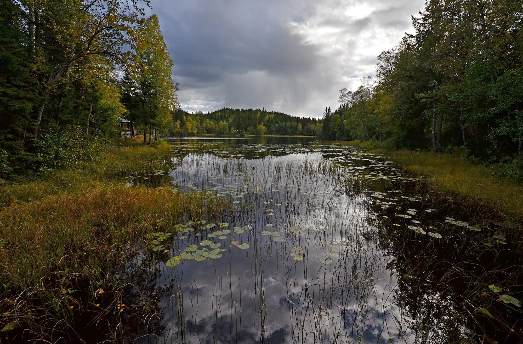 SPØKER OM NATTEN: Som så mange andre skogstjern er også Bønnerudtjern ganske idyllisk, også når det ikke er strålende sol. I bakgrunnen lurer regnbygen som meteorologen glemte å varsle om, men heldigvis snertet den bare vår tur. Dette var et av mange steder på Krokskogen hvor det skulle spøke. Bekken fra Bønnerudtjern renner ned i Retthelltjern og videre ned Nordkleiva.