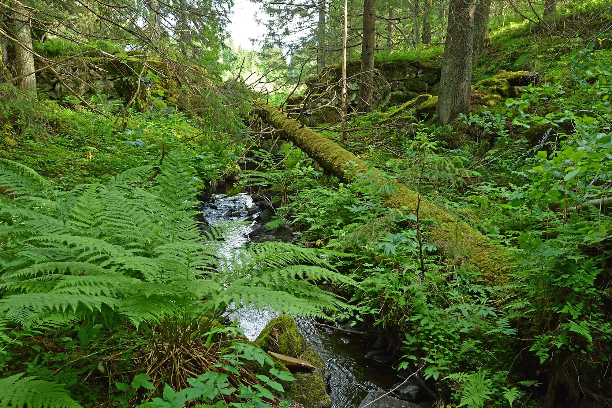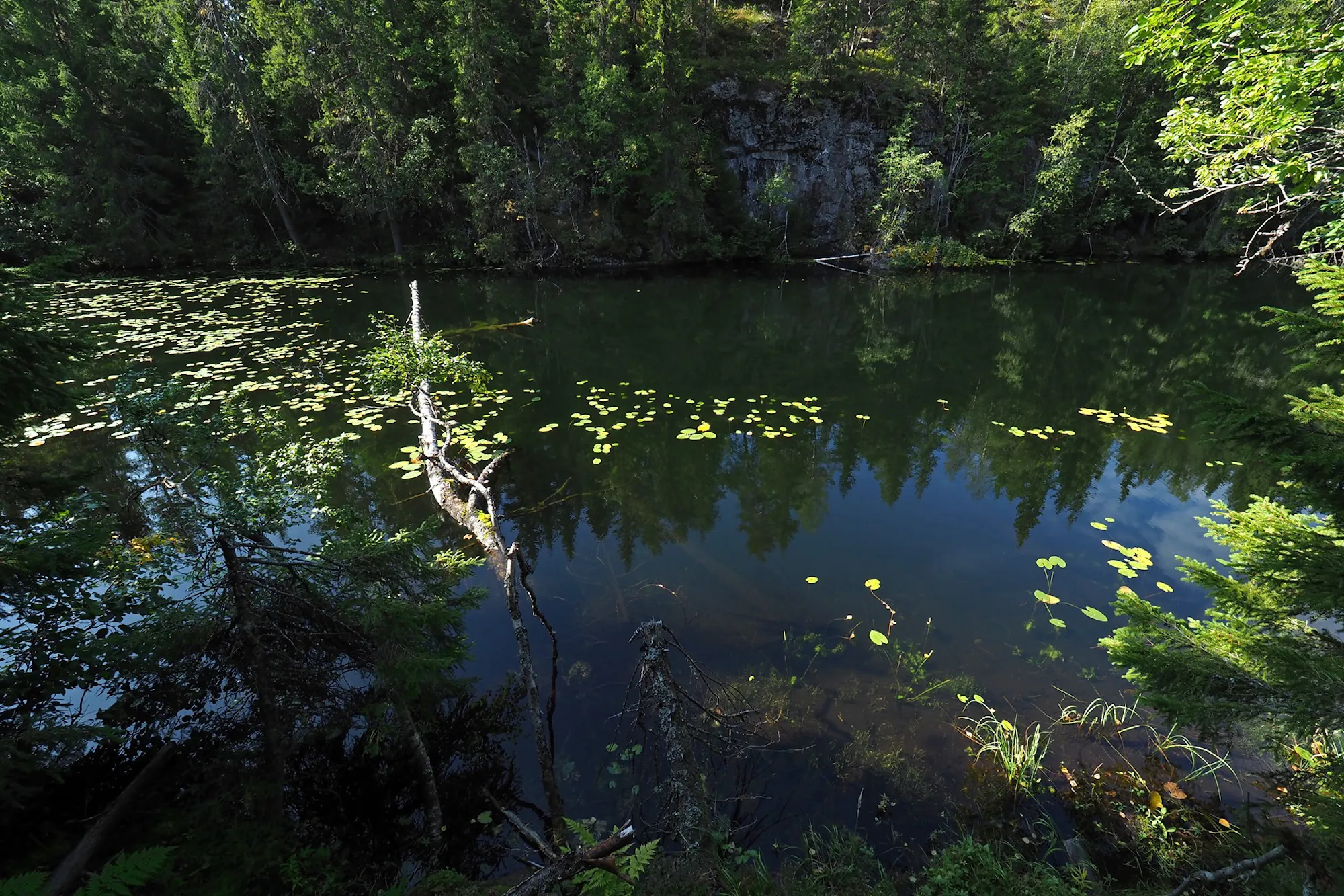MØRKT VANN: Svarttjern nord for Nordsetertjern svarer ganske bra til navnet sitt allerede i fullt dagslys, mørkt vann, trangt med stup på begge langsider. Beliggenheten gjør at det naturlig var et reservoar for Sundvoll-mølla, men spørsmålet er om også dette vannet var oppdemt. Nå som bløtmyra mot syd var relativt tørr, undersøkte jeg den så nøye som det tette krattet der tillot. Det var ingen spor etter en steindemning, og heller ikke etter en enkel tredemning av stokker som var slått ned i myra, selv om bare en meter regulering opp ville øket vannarealet og dermed vannvolumet drastisk.