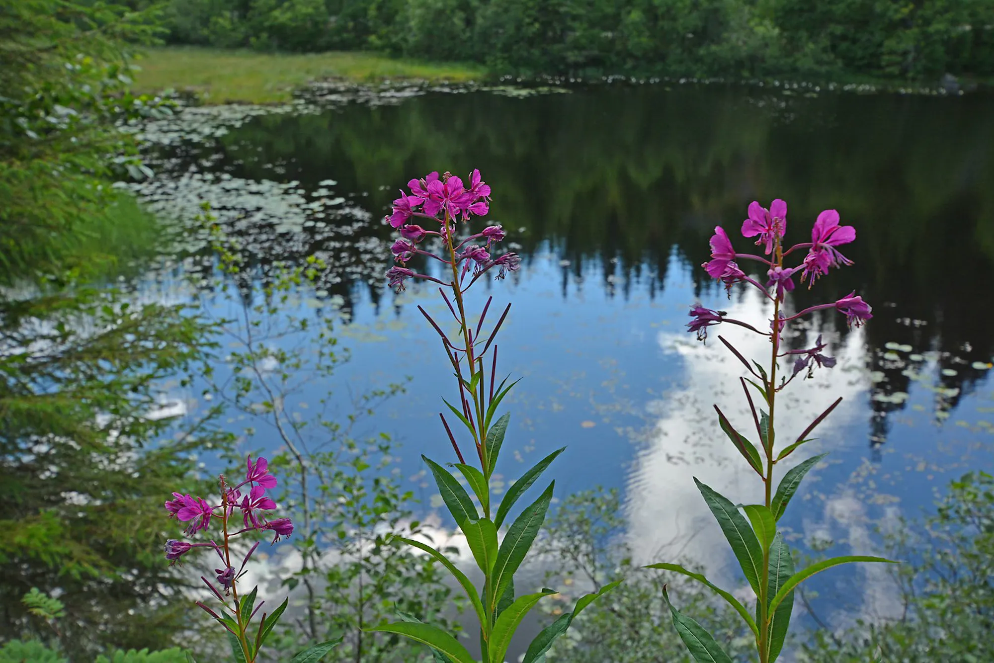 GEITRAMS OG VANNLILJER: Lysløypa fra Bergenske Kongevei går over et stort hogstfelt til sydenden av Nordsetertjern. Over et lite stup er det bra utsikt mot sydenden av vannet. Myra syd for vannet var fuktig, men greit passérbar også denne våte sommeren. Sørsetraveien er synlig gjennom løvverket på motsatt side av vannet.