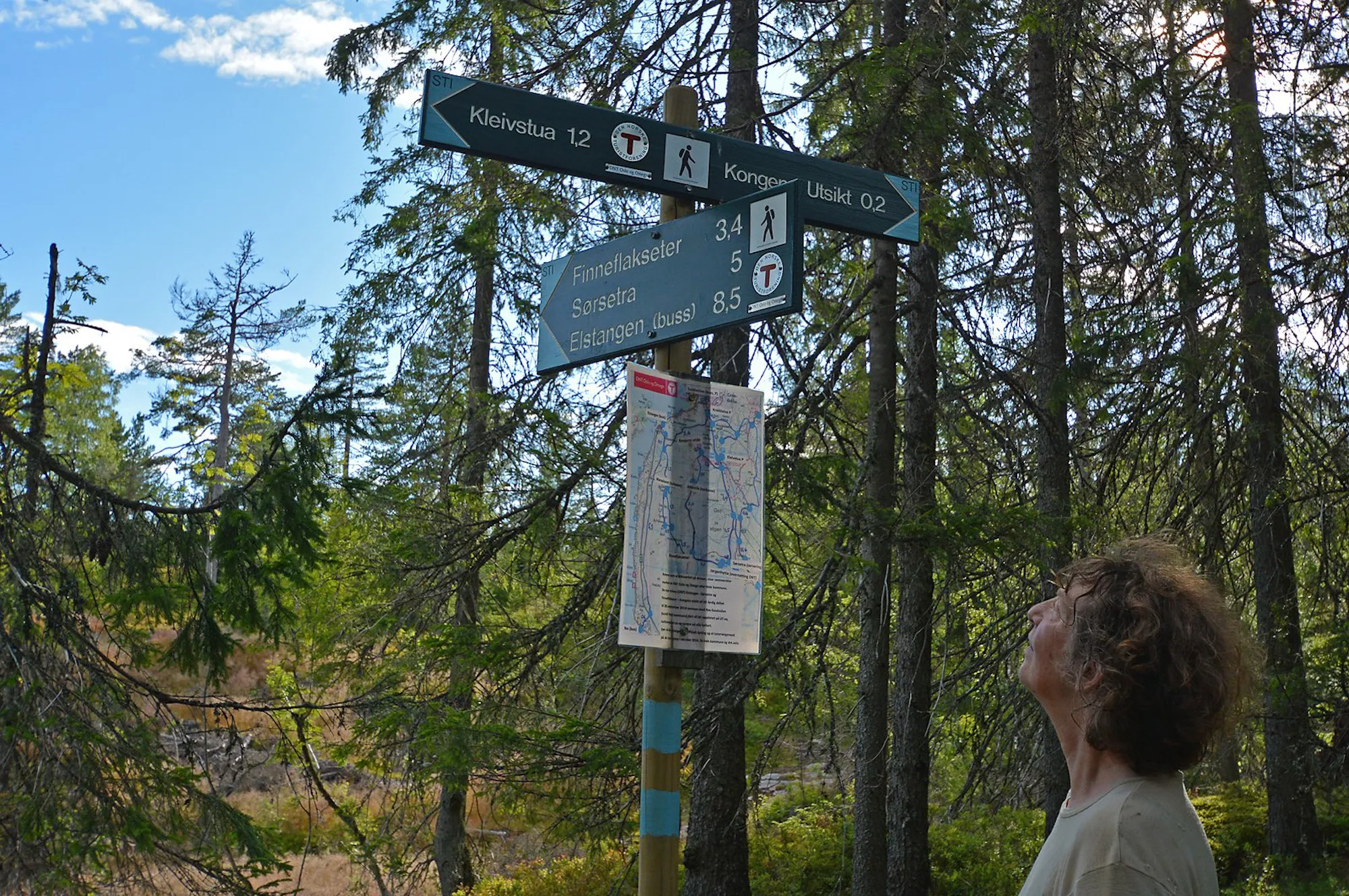 NY STI: DNT er i ferd med å skifte ut og oppgradere sine skilt i Marka. Her, 200 meter sydøst for Kongens Utsikt, har det også kommet til en ny, blåmerket sti til Finneflakseter. Den følger skiløypa mesteparten av veien oppover, men går nær nordenden av Åbortjern og over Åboråsen i stedet for å gå vest for Åboråsen.